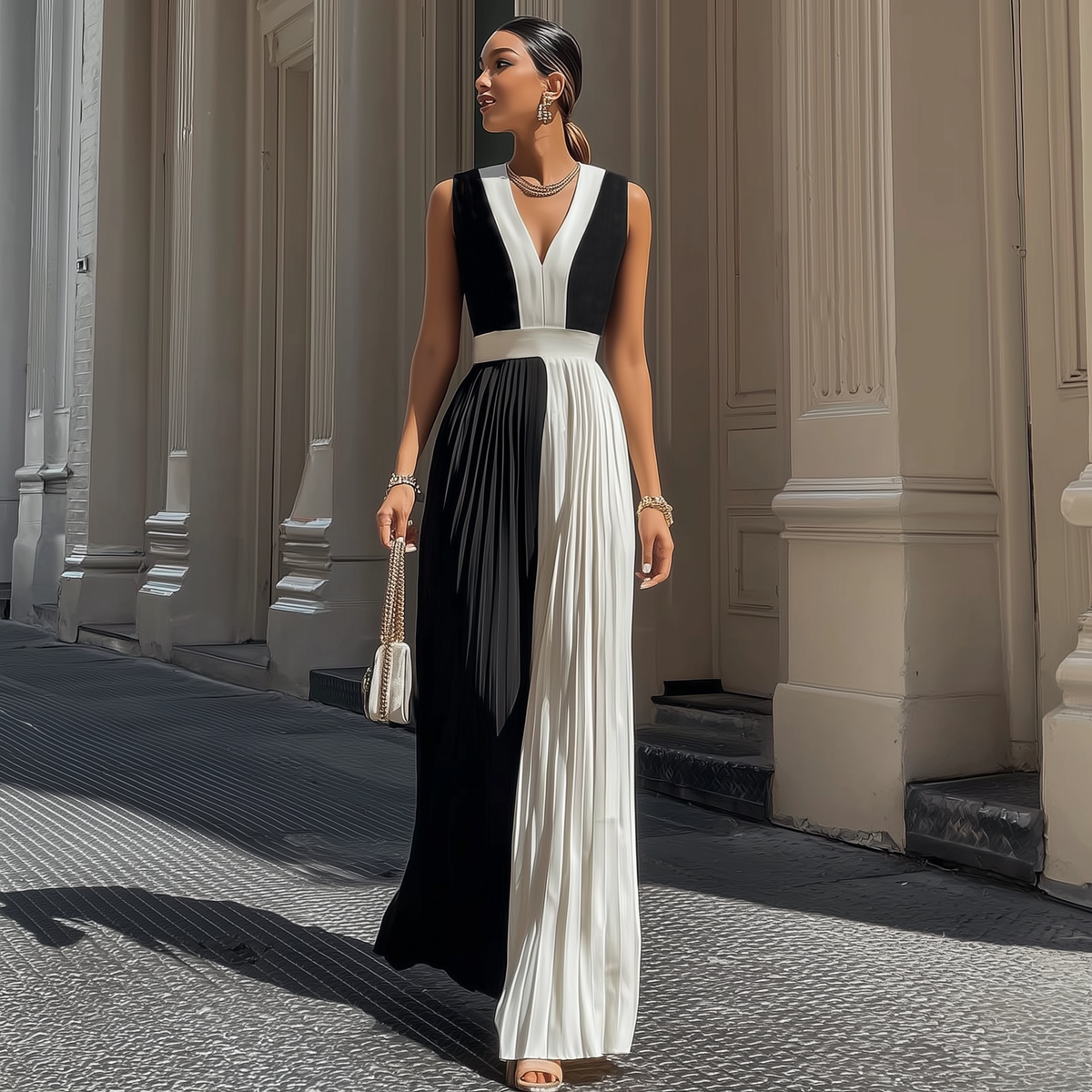 Black And White Contrasting Asymmetrical Pleated Jumpsuit