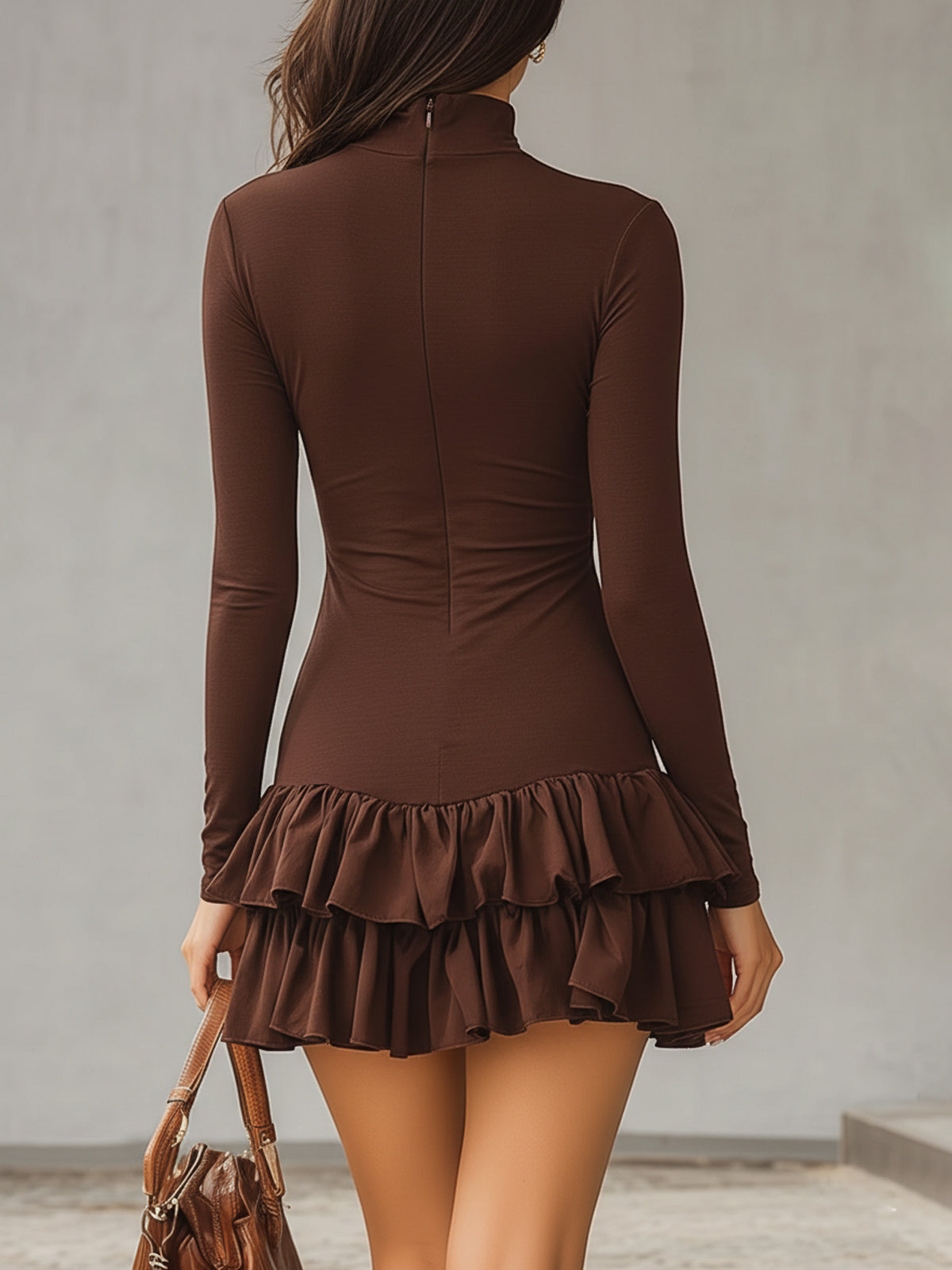 The top features a high-neck, fitted knit design that accentuates the figure, while the double-layered ruffle hem softens the sexy silhouette of the fitted style, adding a touch of sweetness.